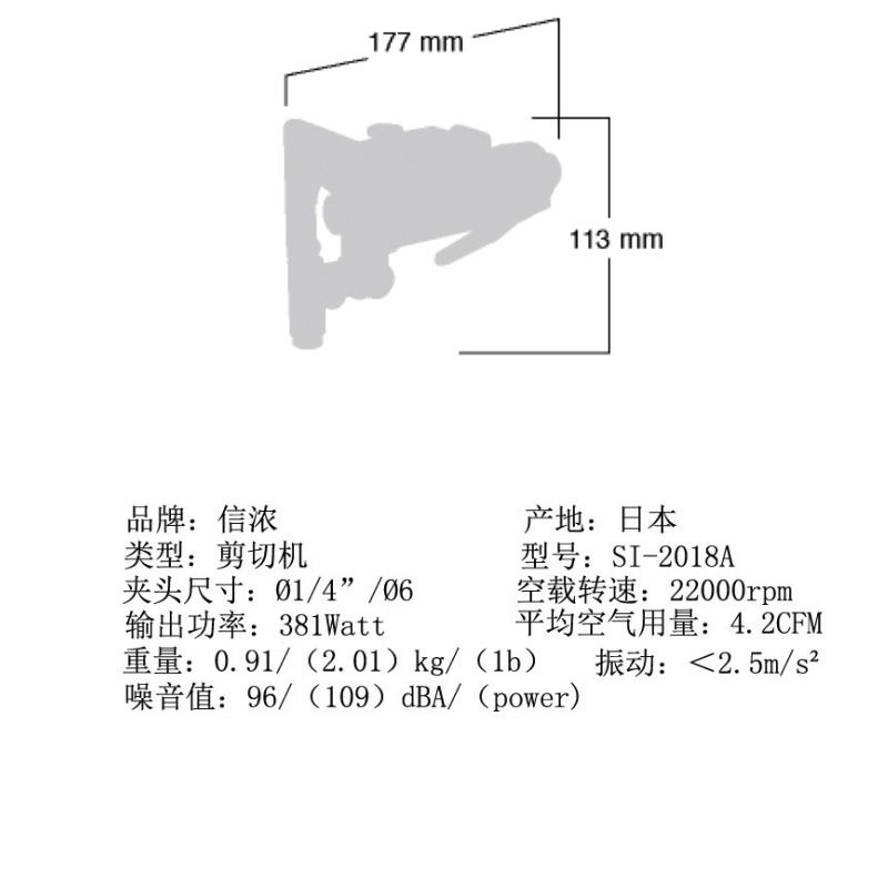 深圳市美萨克气动工具有限公司型号 SI-2018A/2018A-6 夹头规格 Ø1/4''/Ø6 空转转速 rpm 22000 输出功率 Watt 381 重量 kg/(lb) 0.91/(2.01) 噪声级 dBA/(power) 96/(109)