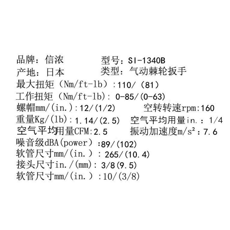 详细信息| 询价留言品牌:日本SHINANO信浓 型号:SI-1340B 加工定制:否 耗气量:2.5 m3/min 产地:日本 方头尺寸:3/8 in 空转速度:160 r/min 驱动杆尺寸:3/8 mm 扭力:110 n.m 进气管尺寸:3/8 in 长度:265 mm 重量:1.14 kg 进气口尺寸:1/4 in 螺栓规格:1 噪音值:89 振动值:7.6 螺栓规格:1 噪音值:89 日本SHINANO信浓SI-1340B气动棘轮扳手3/8扳手进口3/8风炮风扳手是否进口 否 加工定制 否 货号 SI-1340B 品牌 SHINANO信浓 型号 SI-1340B 类型 气动棘轮扳手 方头尺寸 3/8(inch) 螺栓规格 1(mm) 平均耗气量 2.5 工作压力 3(Mpa) 空载转速 160(rpm) 驱动杆尺寸 3/8(mm) 型号 SI-1340B 接头尺寸 in./(mm) 3/8/(9.5) *大扭矩 Nm/(ft-lb) 110/(81) 工作扭矩 Nm/(ft-lb) 0-85/(0-63) 螺帽 mm/(in.) 12/(1/2) 空转转速 rpm 160 重量 kg/(lb) 1.14/(2.50) 噪声级 dBA/(power) 89/(102)