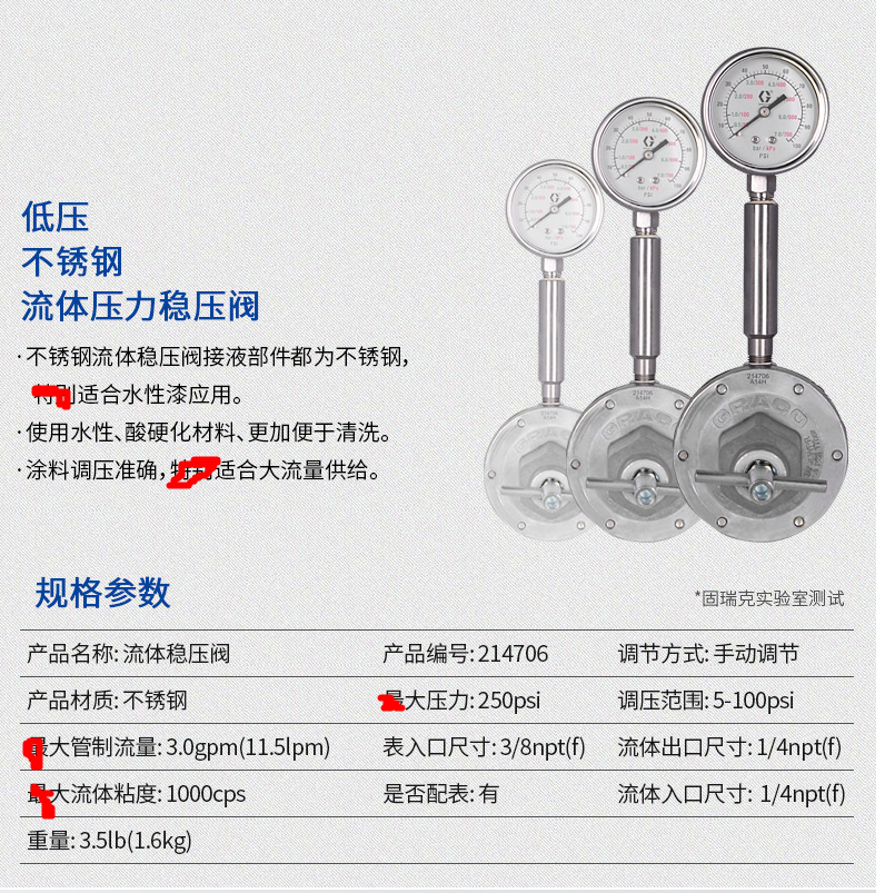 美国GRACO固瑞克214706涂料稳压阀隔膜泵不锈钢阀 油漆调压阀