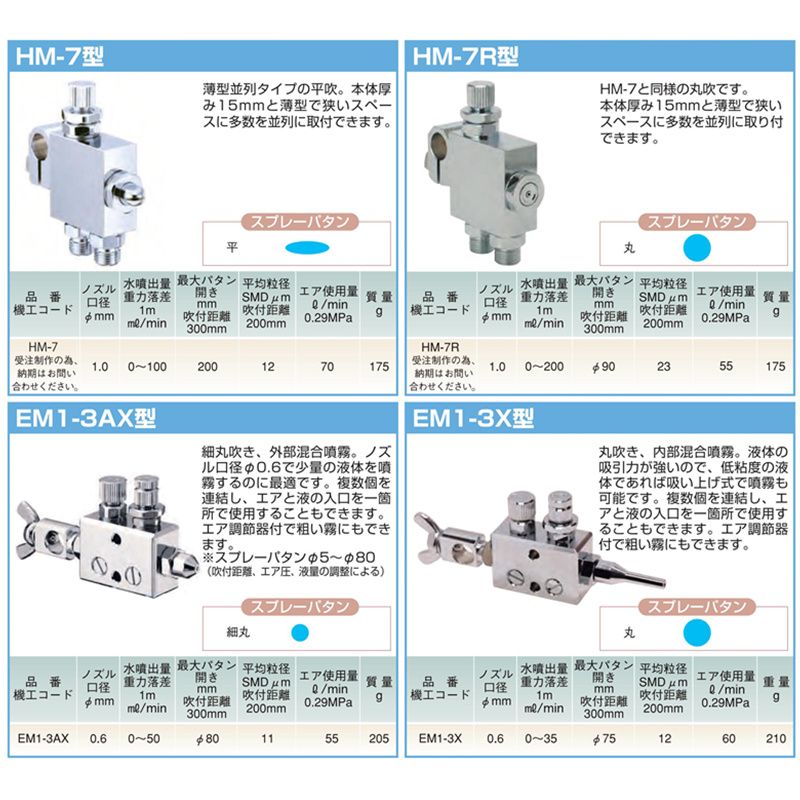 gHM-7 平吹 1.0 0~100 200 12 70 175 HM-7R 圓吹 1.0 0~200 φ90 23 55 175 EM1-3AX 圓吹 0.6 0~ 50 φ80 11 55 205 EM1-3X 圓吹 0.6 0~ 35 φ75 12 60 210 EM1-3LX 極細圓吹 0.7 0~ 35 φ50 13 22 195 ※ 上列噴霧資料為:重力落差1m、噴塗距離300mm、空氣壓力0.29MPa,用水噴塗的情形。