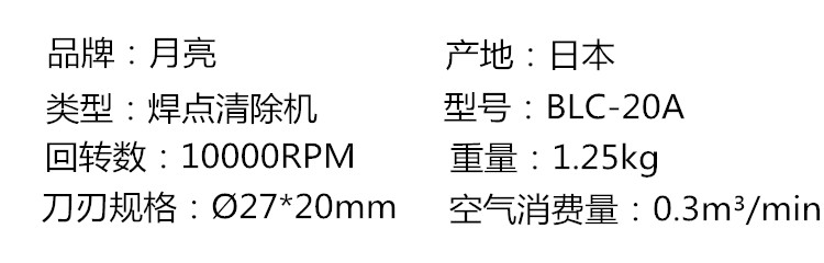 详细信息| 询价留言品牌:日本MINE月亮 型号:BLC-20A 加工定制:否 分类:气动打磨机 盘径 :1 inch 空载转速:10000 rpm 用途:焊点清除 盘径 :1 inch 空载转速:10000 rpm -