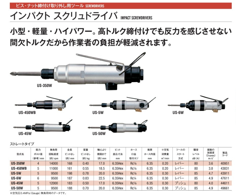 详细信息| 询价留言品牌:日本URYU瓜生 型号:US-50W 加工定制:否 外形:直型 产地:日本 驱动头尺寸:1/4 in 扭力:1 n.m 耗气量:1 m3/min 空转转速:9500 r.p.m 重量:0.7 kg 长度:188 mm 空转转速:9500 r.p.m -