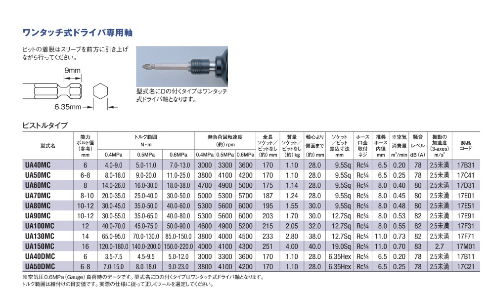 详细信息| 询价留言品牌:日本URYU瓜生 型号:UA50MC 加工定制:否 耗气量:1 m3/min 产地:日本 方头尺寸:3/4 in 空转速度:4200 r/min 驱动杆尺寸:1/2 mm 扭力:1 n.m 进气管尺寸:1/4 in 长度:177 mm 重量:1.2 kg 进气口尺寸:1/4 in 螺栓规格:1 噪音值:1 振动值:1 螺栓规格:1 噪音值:1 -