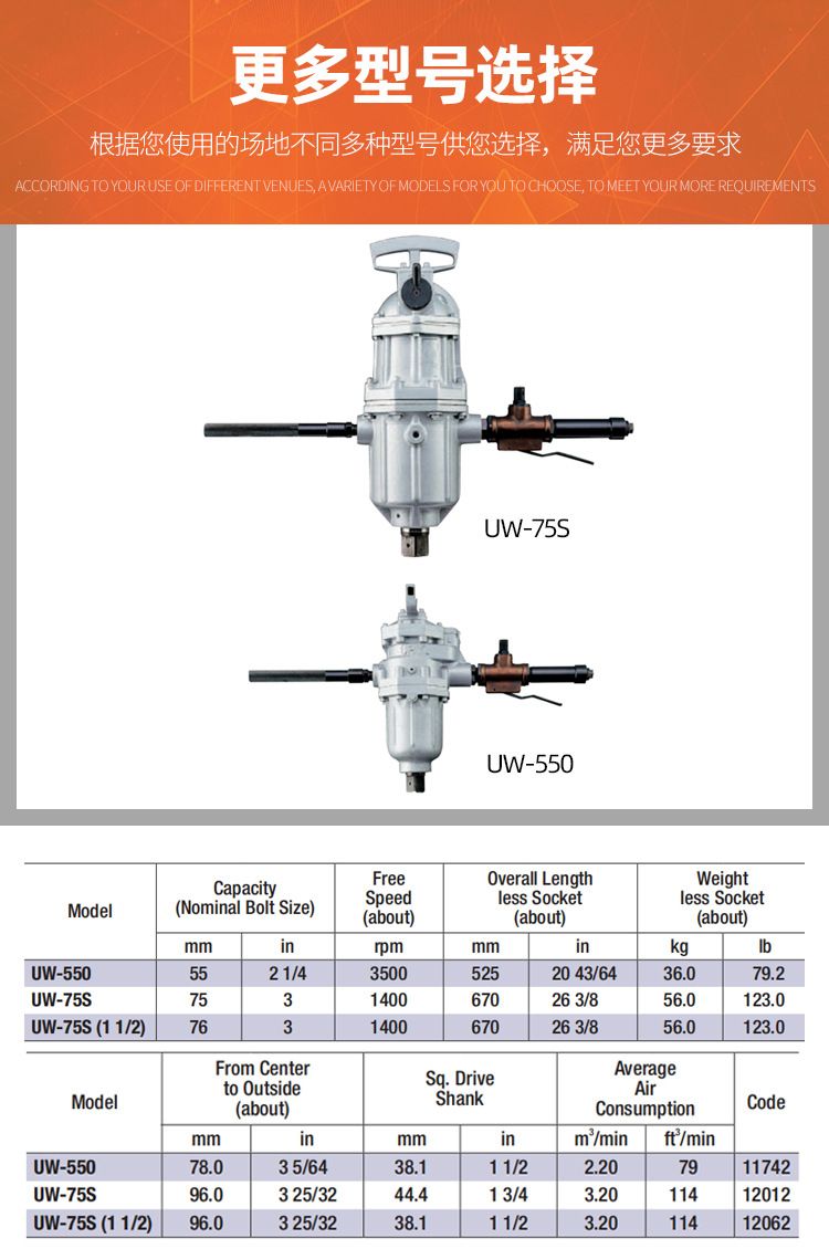详细信息| 询价留言品牌:日本URYU瓜生 型号:UW-550 加工定制:否 耗气量:1 m3/min 产地:日本 方头尺寸:3/4 in 空转速度:3500 r/min 驱动杆尺寸:1/2 mm 扭力:1 n.m 进气管尺寸:1/4 in 长度:146 mm 重量:1.2 kg 进气口尺寸:1/4 in 螺栓规格:1 噪音值:1 振动值:1 螺栓规格:1 噪音值:1 -
