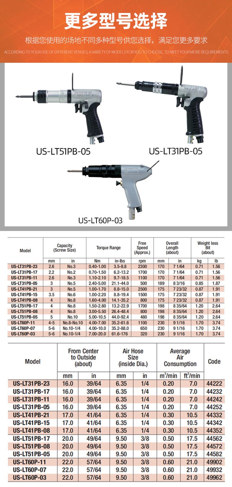 详细信息| 询价留言品牌:日本URYU瓜生 型号:US-LT41PB-08 加工定制:否 外形:枪型 产地:日本 驱动头尺寸:1/4 in 扭力:1 n.m 耗气量:1 m3/min 空转转速:2000 r.p.m 重量:0.8 kg 长度:165 mm 空转转速:2000 r.p.m -