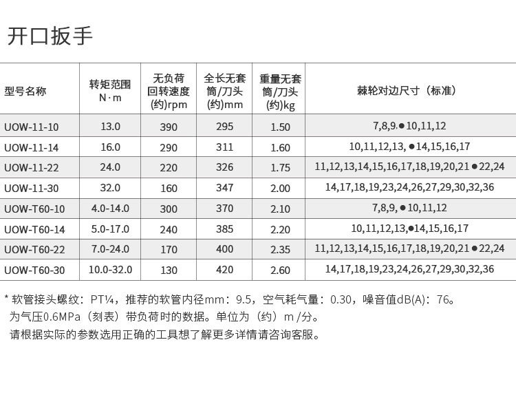 详细信息| 询价留言品牌:日本URYU瓜生 型号:UOW-T60-30 加工定制:否 耗气量:1 m3/min 产地:日本 方头尺寸:3/4 in 空转速度:130 r/min 驱动杆尺寸:1/2 mm 扭力:150 n.m 进气管尺寸:1/4 in 长度:177 mm 重量:1.2 kg 进气口尺寸:1/4 in 螺栓规格:1 噪音值:1 振动值:1 螺栓规格:1 噪音值:1 -
