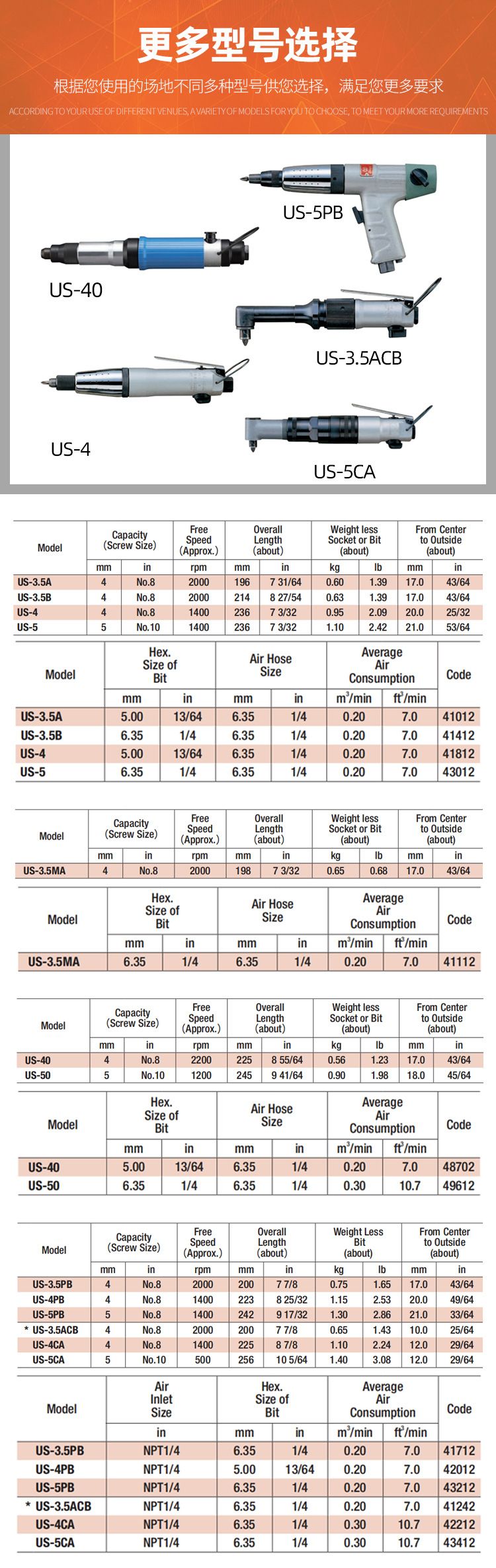 详细信息| 询价留言品牌:日本URYU瓜生 型号:US-50 加工定制:否 外形:直型 产地:日本 驱动头尺寸:1/4 in 扭力:1 n.m 耗气量:1 m3/min 空转转速:1200 r.p.m 重量:0.8 kg 长度:165 mm 空转转速:1200 r.p.m -