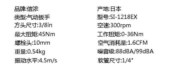 详细信息| 询价留言品牌:信浓 型号:SI-1218 加工定制:否 耗气量:0.35 m3/min 产地:日本 方头尺寸:3/8 in 空转速度:300 r/min 驱动杆尺寸:3/8 mm 扭力:1 n.m 进气管尺寸:1/4 in 长度:168 mm 重量:0.5 kg 进气口尺寸:1/4 in 螺栓规格:10 噪音值:1 振动值:1 螺栓规格:10 噪音值:1 -