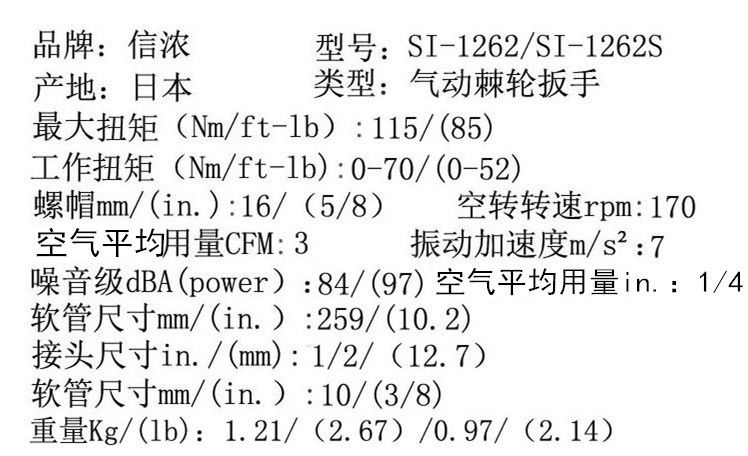 详细信息| 询价留言品牌:日本SHINANO信浓 型号:SI-1262 加工定制:否 耗气量:1 m3/min 产地:日本 方头尺寸:1/4 in 空转速度:170 r/min 驱动杆尺寸:1/4 mm 扭力:1 n.m 进气管尺寸:1/4 in 长度:259 mm 重量:1.2 kg 进气口尺寸:1/4 in 螺栓规格:1 噪音值:1 振动值:1 螺栓规格:1 噪音值:1 -