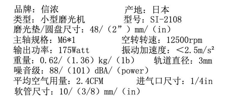 详细信息| 询价留言品牌:SHINANO 型号:SI-2108 加工定制:否 分类:气动打磨机 盘径 :2 inch 空载转速:12500 rpm 用途:研磨 抛光 打磨 盘径 :2 inch 空载转速:12500 rpm -