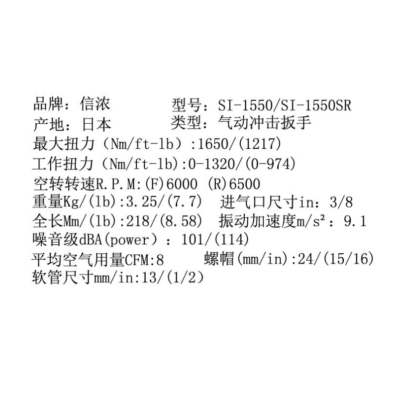 详细信息| 询价留言品牌:SHINANO 型号:SI-1550SR 加工定制:否 耗气量:1 m3/min 产地:日本 方头尺寸:1/4 in 空转速度:6000 r/min 驱动杆尺寸:1 mm 扭力:1 n.m 进气管尺寸:1 in 长度:218 mm 重量:3.25 kg 进气口尺寸:1 in 螺栓规格:1 噪音值:1 振动值:1 螺栓规格:1 噪音值:1 -